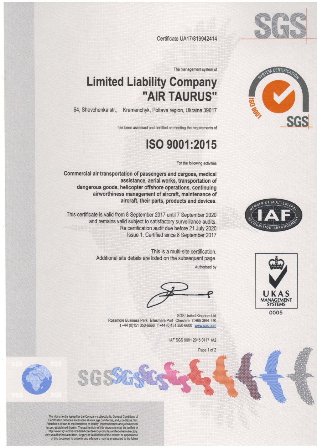 We are pleased to announce that our AOC holder 'AIR TAURUS' has been found to be in compliance with and meeting the stringent requirements of ISO 9001:2015. The certification covers all aspects of AIR TAURUS' operation, including the commercial transportation of passengers and cargo and aircraft maintenance.